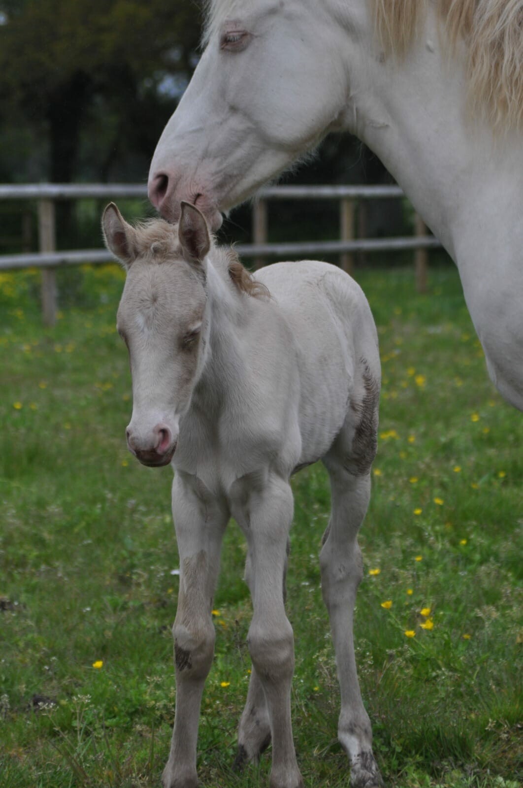 Fille de Salma, onc espagnol crème aux yeux bleu d'environ 1m50 et Harès, étalon importé d'Espagne perlino d'environ 1m60.