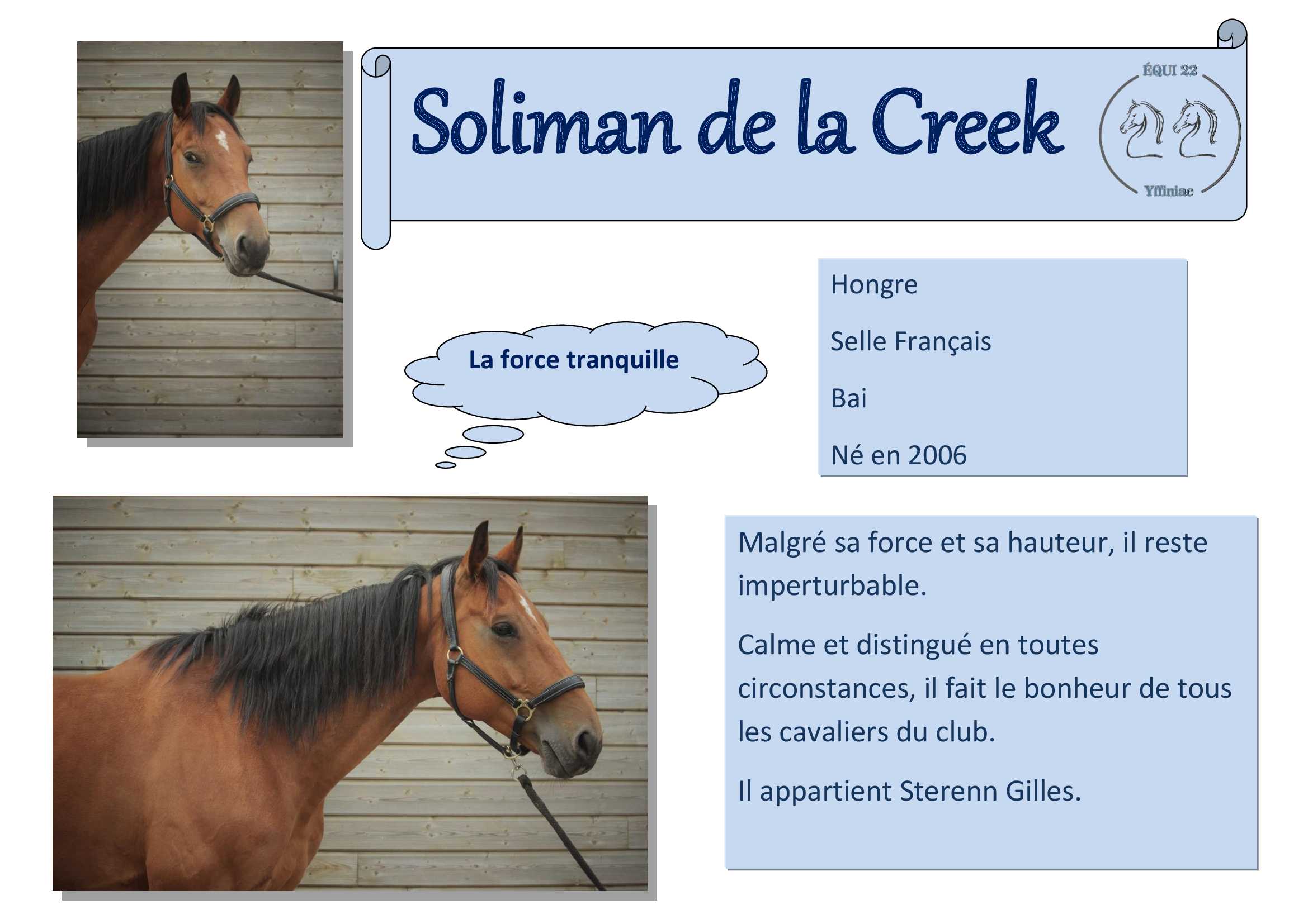 Calme et distingué en toutes circonstances, il fait le bonheur de tous les cavaliers du club.